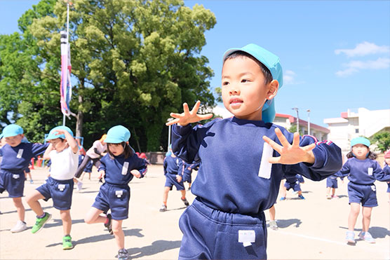 3~5歳児は、子ども専門スポーツ教室のインストラクターによる体育教室を実施しています。各年齢に応じた運動遊びを計画的に行い、運動能力を伸ばすこと以外にも挨拶をする、順番に並ぶなどの集団生活のルールを学ぶといった『社会性』を身に着ける場でもあります。