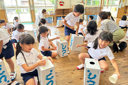 『かがくタイム』は、4・5歳児を対象に、子どもに身近な「科学のふしぎ」をテーマにした体験学習を専門の指導者を招いて実施しています。子どもたちの「なぜ?」や「どうして?」を大切に、科学の楽しさを実感させることで、「筋道立てて考える力」や「自分で問題解決する力」など、「非認知能力」を育みます。