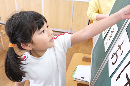 『まなびタイム』は、5歳児を対象に、子どもたちの「学び合い」により、これからの時代に求められる力を着実に伸ばせるように、1回60分で年間30回の系統立てたカリキュラムで、「もじ・ことば・ちえ」の3つの分野の力や、「聞く・話す」などの力を伸ばします。幼児の学びを専門とした指導者を招き実施しており、学ぶことの楽しさを大切に、小学校生活への期待を広げることができるよう工夫しています。